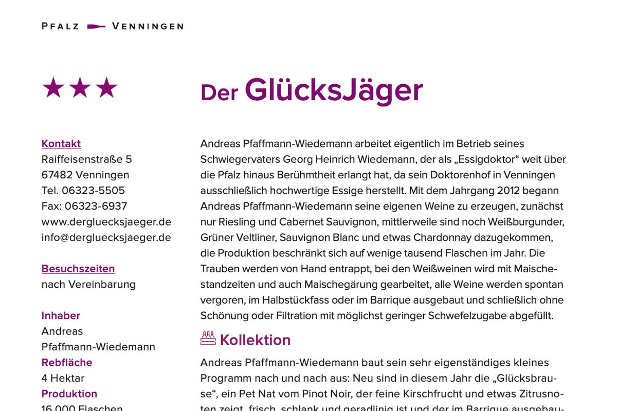 Andreas Pfaffmann-Wiedemann arbeitet eigentlich im Betrieb seines Schwiegervaters Georg Heinrich Wiedemann, der als „Essigdoktor“ weit über die Pfalz hinaus Berühmtheit erlangt hat, da sein Doktorenhof in Venningen ausschließlich hochwertige Essige herstellt. Mit dem Jahrgang 2012 begann Andreas Pfaffmann-Wiedemann seine eigenen Weine zu erzeugen, zunächst nur Riesling und Cabernet Sauvignon, mittlerweile sind noch Weißburgunder, Grüner Veltliner, Sauvignon Blanc und etwas Chardonnay dazugekommen, die Produktion beschränkt sich auf wenige tausend Flaschen im Jahr.