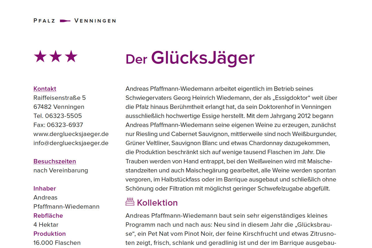 Andreas Pfaffmann-Wiedemann arbeitet eigentlich im Betrieb seines Schwiegervaters Georg Heinrich Wiedemann, der als „Essigdoktor“ weit über die Pfalz hinaus Berühmtheit erlangt hat, da sein Doktorenhof in Venningen ausschließlich hochwertige Essige herstellt. Mit dem Jahrgang 2012 begann Andreas Pfaffmann-Wiedemann seine eigenen Weine zu erzeugen, zunächst nur Riesling und Cabernet Sauvignon, mittlerweile sind noch Weißburgunder, Grüner Veltliner, Sauvignon Blanc und etwas Chardonnay dazugekommen, die Produktion beschränkt sich auf wenige tausend Flaschen im Jahr. Die Trauben werden von Hand entrappt, bei den Weißweinen wird mit Maischestandzeiten und auch Maischegärung gearbeitet, alle Weine werden spontan vergoren, im Halbstückfass oder im Barrique ausgebaut und schließlich ohne Schönung oder Filtration mit möglichst geringer Schwefelzugabe abgefüllt.